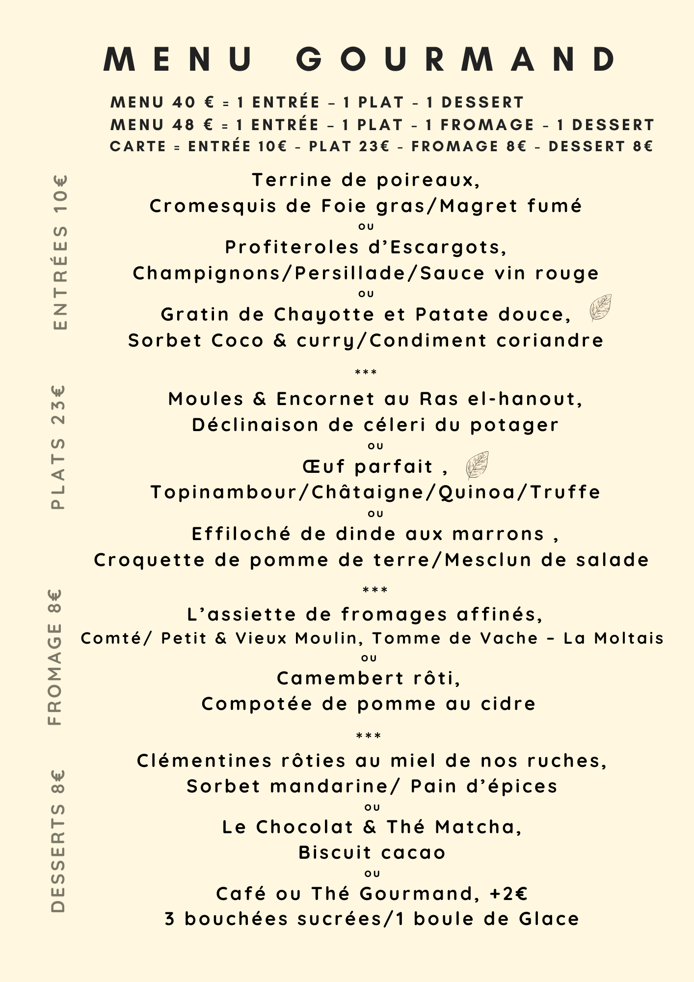 MENU DU MARCHE, MENU GOURMAND, MENU ESSENTIEL dans le but de satisfaire tous les goûts. Mixez les menus selon vos envies.